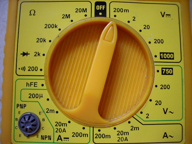 Si estamos midiendo 0,4 voltios, en un multimetro sin autorango, tendremos que ajustar, mediante la rueda de selección, el rango o escala de medida a la más adecuada inmediatamente superior. O si no conocemos el valor aproximado de lo que vamos a medir, tendremos que llevar la rueda al rango más alto, para después irlo bajando si la medida lo permite.