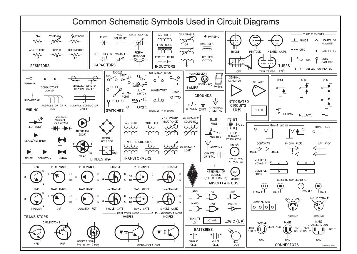 En la siguiente tabla podemos encontrar Símbolos de Componentes Electrónicos muy habitualmente utilizados en Esquemas de Circuitos Electrónicos. Sus nombre aparecen en inglés, lo que puede resultar muy útil a la hora de localizar información o repuestos en Internet.